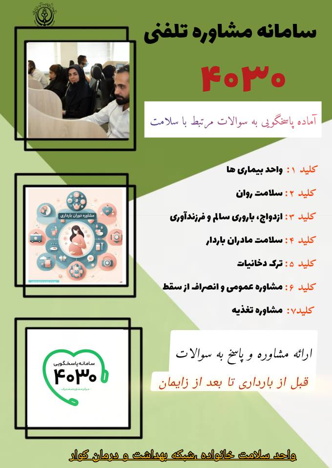 به گزارش روابط عمومی شبکه بهداشت و درمان شهرستان کوار، سامانه تلفنی 4030 در ایام نوروز آماده پاسخگویی و ارائه خدمات مشاورهای در حوزههای مختلف سلامت به عموم مردم است.